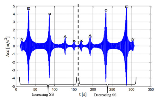 In addition to white noise tests, increasing and decreasing sine sweep tests were conducted for the dynamic characterization of the three-story structure equipped with a non-conventional TMD. A typical time history registered by one accelerometer placed along the structure for increasing and decreasing SS test is depicted in Figure 11. When the SS passes through the resonance frequencies of the structure, a rapid increase in the response is observed. By taking the maxima and knowing the variation in the excitation frequency, it is possible to estimate the structural resonances directly from the time histories. Specifically, in the figure, it is possible to notice that the time history applied increasing in the first 150 s and decreasing in the last 150 s is not perfectly symmetrical due to nonlinearities introduced by the HDRB isolators. The corresponding resonances observed with increasing and decreasing sine sweep are indicated in Figure 11 with the same symbols. It is possible to observe that the amplifications are slightly different.