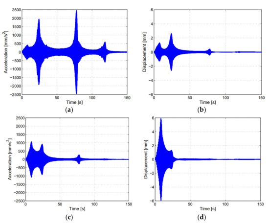 Figure 12a–d show the time histories with increasing SS of absolute acceleration at the support level, relative displacement at the support level, absolute acceleration at the fourth floor, and relative displacement at the fourth floor, respectively. Six resonance frequencies are visible from the support level absolute acceleration time history (Figure 12a), as was observed with the PFRF in Figure 8a. Three resonance frequencies are visible from the relative displacement at the support level (Figure 12b), as observed with the PFRF in Figure 8b, and the absolute acceleration at the fourth floor (Figure 12c), as indicated with the PFRF in Figure 8c. However, only the first two frequencies are visible from the relative displacement at the fourth floor (Figure 12d), as observed with the PFRF in Figure 8d.