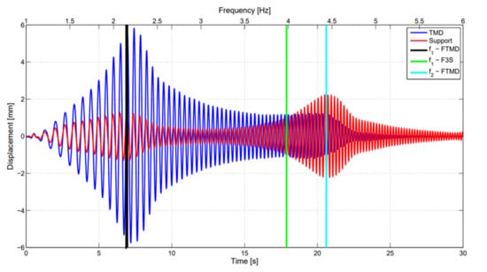 Figure 13 reports details of the time history of the inter-story drift between the TMD mass and the support plane overlapped to the support level relative displacement time history, in the range where the first two resonance frequencies of the structure in the FTMD configuration appear. In the figure, the first two frequencies of the FTMD configuration and the first frequency of the F3S configuration are reported as well.