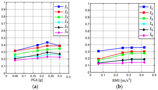 Considering the Kobe earthquake, in Figure 15a it can be shown that the indices evaluated in terms of peak values at first increase and then decrease with the PGA. Since the F4 configuration behaves linearly, these results highlight the nonlinear behavior of the structure controlled with a non-conventional TMD. All the indices have values lower than the unity, demonstrating the effectiveness of the TMD in reducing the structural responses. The reduction observed from the floor accelerations through indices , , and increases with the height, with percentages of reductions in the range of 60–75%. Concerning the displacement reduction, index modestly varies with the PGA, showing a reduction around 75%. Base shear and base moment, and , have the same trend versus the PGA and show reductions of 75–80%. The indices evaluated in terms of RMS values modestly increase with the PGA and generally have higher reductions compared to the corresponding ones evaluated in terms of peak values.
