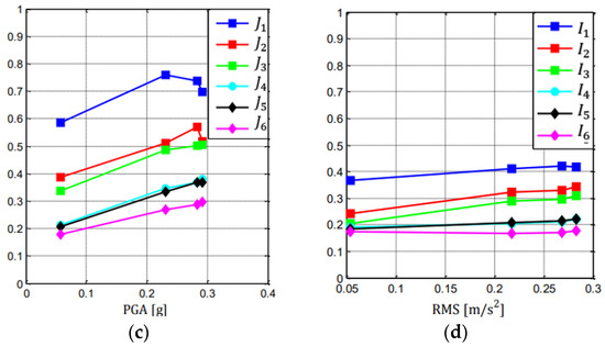 Considering the far-field earthquakes, in Figure 16a,b the response indices in terms of peak and RMS values are depicted for El Centro. The acceleration peak values, , , and do not have the same trend with the PGA varying the floor: the reductions oscillate from a minimum of 50% to a maximum of almost 75%. Instead, displacement, base shear, and base moment have modest variations with the PGA, oscillating with reductions around the 70–75%. By looking at indices in terms of RMS (Figure 16b), it can be seen that , , , and are almost constant with the PGA, with reductions of around 60% for the first floor acceleration and around 80% for the displacement, base shear, and base moment. Instead, the second and third floor acceleration , and have almost the same reductions, decreasing with the PGA from almost 85% to 65%. Figure 16c,d depict the response indices in terms of pack and RMS values for the Hachinohe earthquake. Generally, considering the peak indices (Figure 16c), as observed for El Centro, for the accelerations , , and the trend of reduction is not regular with the PGA and the floor considered, with reductions from 40–55%. Considering the displacement, modestly varies with the PGA, with reduction from 55% to almost 70%. The base shear, is constant, with a reduction of almost 70%, whereas the base moment, slowly decreases with the PGA, with reductions around 70–75%. The same indices considering the RMS values (Figure 16d) instead have an almost constant trend with the PGA, with reductions of 55–70% for floor accelerations, , , and , and around 80% for displacement, base shear, and base moment (, , and .