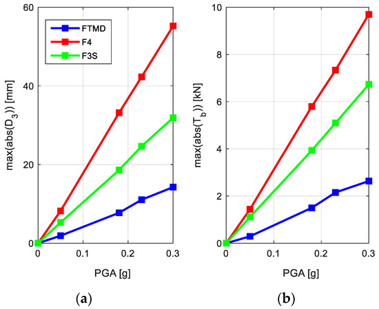 The results are synthetically reported for two exemplificative response quantities, the maximum values of the third floor displacement D3 and the base shear Tb in Figure 17a,b, respectively, in the case of Kobe earthquake at different intensities, comparing the FTMD configuration with F4 and F3S configurations. In the case of F4 and F3S configurations, the responses have a linear trend, whereas in the case of the FTMD configuration the responses are modestly nonlinear. It is possible to notice that the insertion of the TMD is effective if applied to both cases for each response. In addition, the maximum effectiveness is obtained by implementing inter-story isolation from an original non-segmented structure (FTMD vs. F4 configuration).
