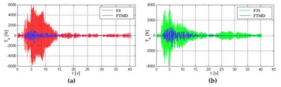 NE—time history of the base shear for Kobe earthquake at given intensity level, PGA = 0.18 g: (a) FTMD vs. F4 configuration, (b) FTMD vs. F3S configuration.