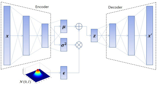 Usually, the approximation distribution for VAE is Gaussian distribution, and the VAE model needs the reparameterization trick [16] for a learning network, because the reconstruction loss term, , is derived from sampling on q. Nonetheless, it is not able to differentiate between and . So, sampling for normal distribution was separated from the encoder, and it made back-propagation possible. Latent distribution z can be shown as follows: