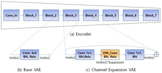 In Figure 3, when the encoder splits into blocks; (b) base VAE and (c) channel expansion have different elements in the block. Each block consists of convolution and batch normalization and Relu in (b) base VAE. On the other hand, (c) channel expansion VAE (CEVAE) has depth-wise convolution and 1 × 1 convolutions at the front and the rear, respectively. Convolution supersedes depth-wise convolution in order to reduce the computation derived from expansion.