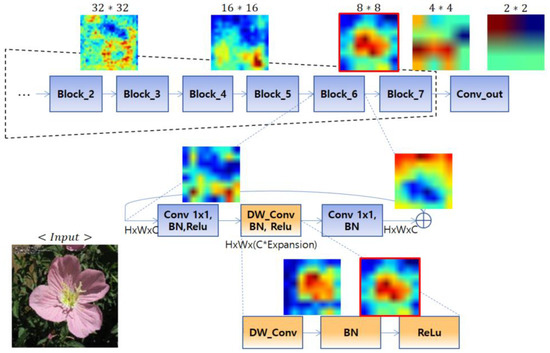 As shown in Figure 5, the activation map capturing the flower region precisely appears in block 6. Hence, the activation maps of “DW_Conv” and “ReLu” in block 6 were average and used for binary masks to reduce an effect from the background.