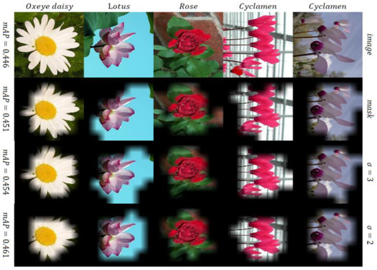 In Figure 6, the threshold of the mask takes the mean value of the activation map, and its masking increased the mAP, but the increment was small (2%). Furthermore, we applied a Gaussian filter, since most of the flowers were placed in the center of the image. The variance of the Gaussian filter was tested at one to four because the feature size was 8 × 8. When the variance size was two, precision was shown to be the best—46.1%. With the filter and mean mask, performance was extremely varied in accordance with the class of flower. Total mAP increased, but the prediction rate of some classes decreased. For instance, a portion of the oxeye daisy was hidden but the rose image still included the background part.