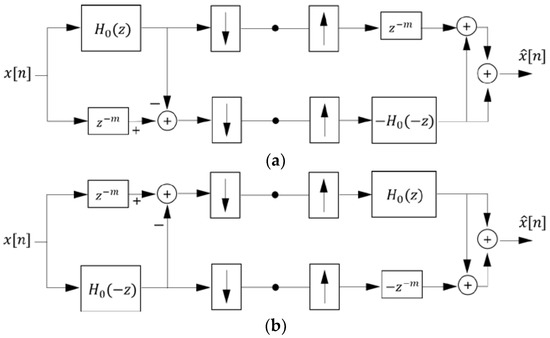 A two-channel DWT filter bank consists of analysis and synthesis banks, as shown in Figure 1 where , are the transfer functions of analysis bank filters, and , are the synthesis filters. The reconstruction signal, in general, suffers from aliasing, amplitude and phase distortions, due to the fact that these filters are not ideal [15,16,17]. As is well known, aliasing frequencies are removed completely by substituting and . Then, the overall system function of the alias-free filter bank can be written as [18,19,20,21,22,23,24,25,26]