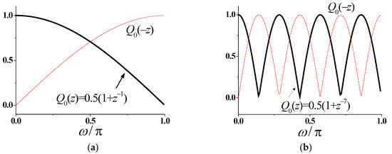 Figure 4 shows the frequency responses of two filters with two coefficients described in Equations (26) and (27). The analysis s-filter bank using the two-tap lowpass filter of Equation (26) leads to a symmetric subband decomposition since both filtered and subtraction-loop bands have a half bandwidth of , while using the comb filter of Equation (27) displays the frequency response that shows regularly spaced peaks giving the appearance of a comb [31]. The two-tap filter examples show that the lower and upper bands performed by the analysis s-filter bank have centrally symmetric frequency responses.