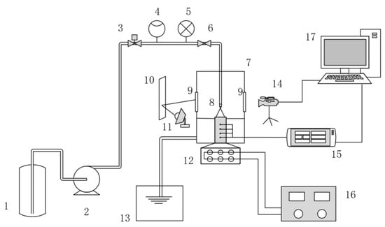 Schematic diagram of spray system. 1 liquid storage tank; 2 micro high-pressure pump; 3 flow adjustment valve; 4 flow meter; 5 pressure gauge; 6 stop valve; 7 spray chamber; 8 nozzle; 9 observation window; 10 reflector; 11 fill light; 12 heating rod; 13 waste liquid collection tank; 14 high-speed camera; 15 data acquisition instrument; 16 heating power regulator; 17 computer.
