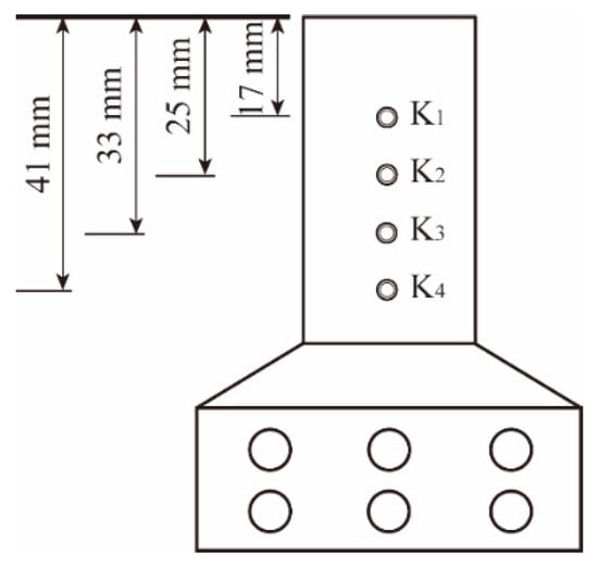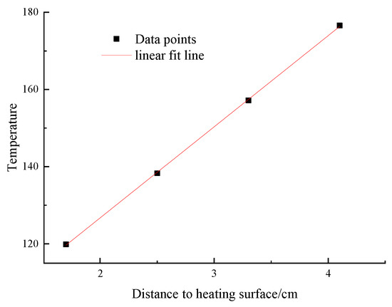 Aluminum silicate fiber wool is installed around the heating block to isolate the heating block from the external thermal environment, so the heat transfer from the side of the heating block can be ignored and the temperature change inside the heating block follows the one-dimensional thermal conductivity law. The heat flux at the surface of the simulated heat source can be obtained from Fourier’s one-dimensional thermal conductivity law as shown in Equation (1).