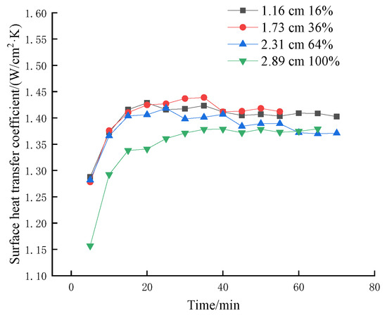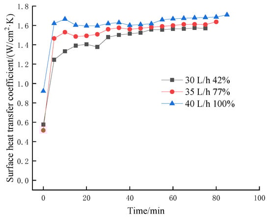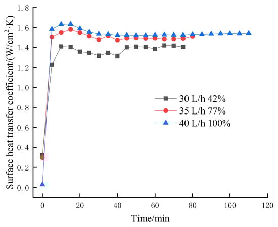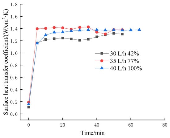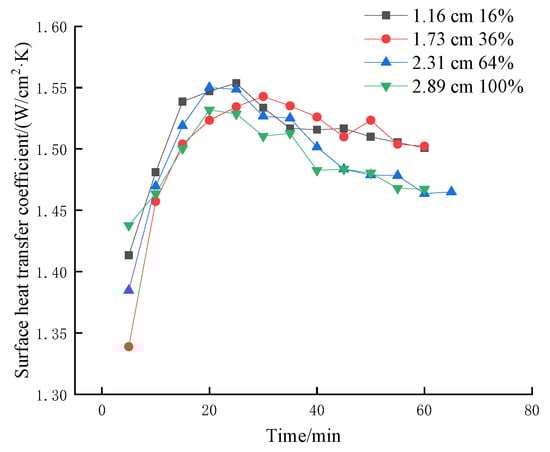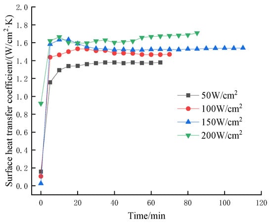 As shown in Figure 4, the transient surface heat transfer coefficient increases with the increase in the heating heat flux during the overall heating process. The surface heat transfer coefficient increases monotonically with time at a heat flux of 50 W/cm2 and stabilizes at 50 min. In the process of changing the transient surface heat transfer coefficient with heat flux of 100 W/cm2, 150 W/cm2 and 200 W/cm2, it appears that the heat transfer coefficient first rises and then decreases, and finally stabilizes. The trend is more obvious in the case of 150 W/cm2 and above. Combined with the visualization and analysis process, it can be found that when the system starts to operate, the surface heat flux increases sharply, causing a significant increase in the heat transfer coefficient. With increasing heat flux, smaller droplets evaporate rapidly on the heating surface to produce a vapor layer, and the heat exchange between some droplets and the heat source surface is resisted by the vapor. As time increases, as the droplet’s own velocity overcomes the effect of vapor on heat exchange, the hindering effect of a small number of small droplets evaporating and the overall cooling heat exchange reach a state of equilibrium. Therefore, the transient heat transfer coefficients tend to be stable after 60 min.