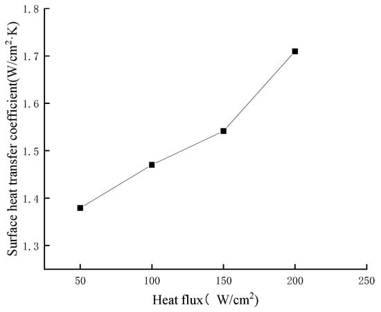 The effect of heat flux variation on the steady-state surface heat transfer coefficient is shown in Figure 5. The steady-state surface heat transfer coefficient increases with the increase in the heating heat flux. The simulated heat source surface heat flux is directly dependent on the heating heat flux, Therefore, when the heating heat flux is small, the surface temperature and heat flux of the simulated heat source are small, and the heat exchange between the heat source surface and the spray droplets is carried out in the non-boiling zone with a small heat transfer coefficient. With the increase in the heating heat flux, the simulated heat source surface heat exchange enters the boiling zone, and the larger the surface heat flux, the greater the boiling degree, and the heat transfer coefficient is the greater.