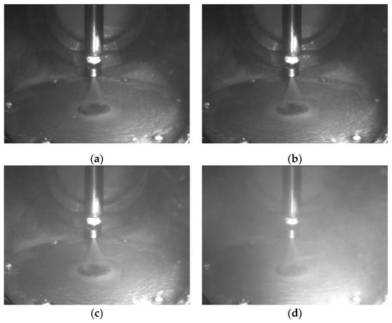 Visualization images of the influence of flow rate change on spray coverage at a heating heat flux of 100 W/cm2: (a) flow rate 25 L/h; (b) flow rate 30 L/h, coverage 42%; (c) flow rate 35 L/h, coverage 77%; (d) flow rate 45 L/h, coverage 100%.