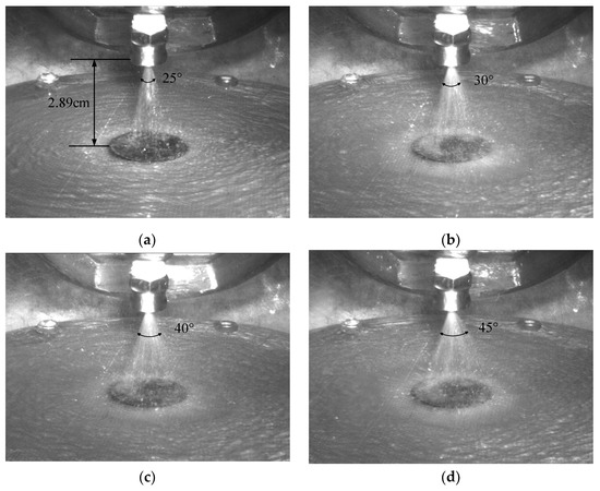 The visualization images of the interior of the chamber with the flow rate of 25 L/h, 30 L/h, 35 L/h and 40 L/h with 100 W/cm2 heating heat flux are shown in Figure 7. As can be seen from the nozzle product manual and computer measurements, in this experimental system, when the Ge Qiang 1/8 1 mm nozzle flow rate is 25 L/h, the spray cone angle is 25°, as illustrated in Figure 7a. The droplet jet cannot overcome gravity’s acceleration when the flow rate is too low, so a complete spray cone cannot be formed and a corresponding coverage cannot be calculated. The spray cone angle is 30° when the flow rate is 30 L/h, 40 degrees when the flow rate is 35 L/h, and 45 degrees when the flow rate is 40 L/h. By setting nozzle coverage to 100% at a flow rate of 40 L/h, it is possible to determine a nozzle height of 2.89 cm. With this height fixed, reducing the flow rate to 35 L/h and 30 L/h, the corresponding coverage rates can be calculated as 77% and 42%, respectively.