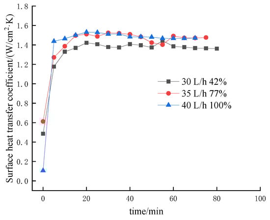 Transient surface heat transfer coefficient with change of heat flux at a flow rate of 40 L/h.