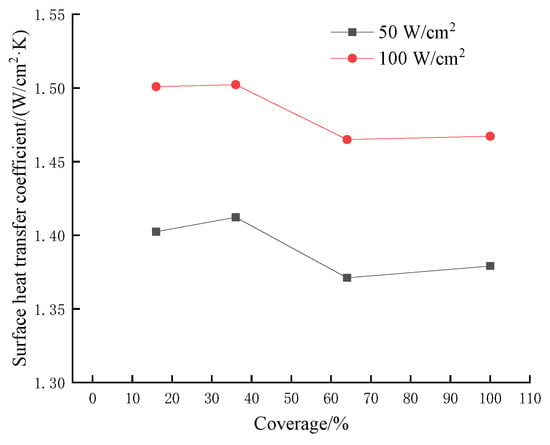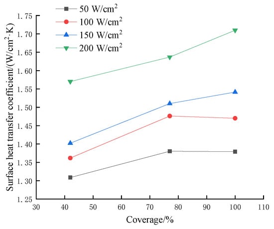 Figure 12 shows the effect of coverage on steady-state surface heat transfer coefficient by changing flow rate effect of varying coverage by flow rate. It can be seen from the figure that the steady-state surface heat transfer coefficient increases with increasing coverage at higher heat fluxes. This coverage increases as the flow rate increases, so the greater the coverage, the greater the number of droplets on the heat transfer surface, the stronger the heat transfer effect in the boiling zone at high heat fluxes, and therefore the heat transfer coefficient increases. At the heat flux of 100 W/cm2 and below, the surface heat transfer coefficient first increases and then slightly decreases with the increase in coverage. As can be seen from Figure 8, Figure 9, Figure 10 and Figure 11, the transient surface heat transfer coefficient fluctuates for large flow rates and small heating heat fluxes. Therefore, the steady-state heat transfer coefficient also decreases. Figure 12 also further verifies the above conclusion.