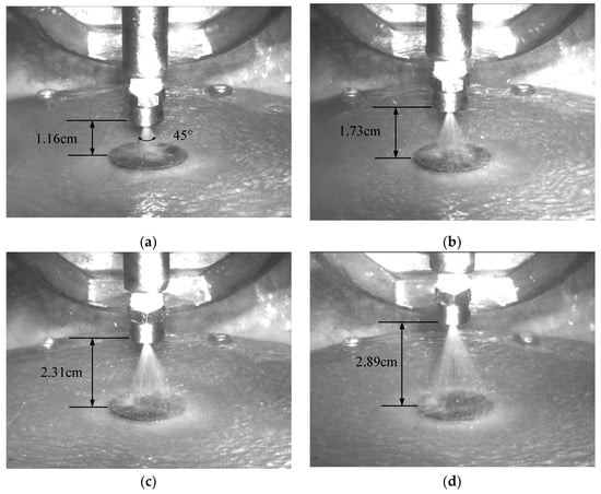 Visualization images of the effect of nozzle height change on spray coverage at a flow rate of 40 L/h: (a) height 1.16 cm, coverage16%; (b) height 1.73 cm, coverage 36%; (c) height 2.31 cm, coverage 64%; (d) height 2.89 cm, coverage 100%.