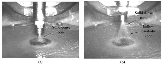 Visualization images of spray cone shape: (a) solid dense cone, coverage16%; (b) solid dense cone and hollow parabolic cone.