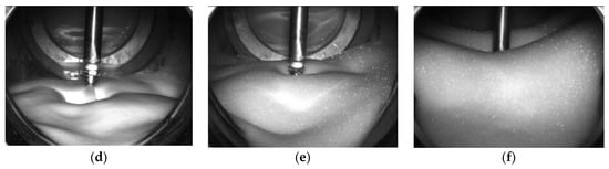 Visualization images of the foam inside the chamber at different CTAB concentrations: (a) 50 ppm; (b) 100 ppm; (c) 150 ppm; (d) 200 ppm; (e) 250 ppm; (f) 300 ppm.