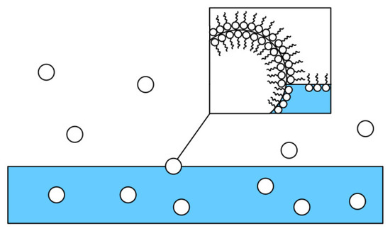 After the concentration reaches the optimum value, the high foamability of the surfactant gradually dominate as the concentration continues to increase. As shown in Figure 19, the foaming inside the cavity gradually increases and hinders the flow of the surface liquid film. Therefore, the heat transfer coefficient decreases and at a concentration of 300 ppm a deterioration of heat transfer is produced. In addition, when the bubbles are detached from the liquid film, the hydrophilic groups of CTAB are adsorbed on the inner and outer surfaces of the bubbles, respectively, which increases the stability of the bubble structure. When the solution concentration is high, the molecules are closely arranged on the inner and outer surfaces of the bubble, as shown in Figure 20. The bubbles are so difficult to collapse that the heat transfer process is affected.