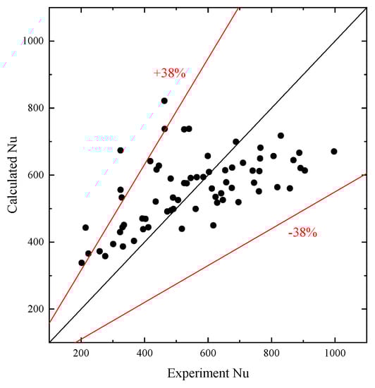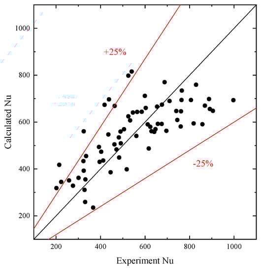 Figure 25 shows a comparison between Nu calculated from the experimental parameters and Nu calculated using Equation (20). As can be seen from Figure 23, for the criterion correlation equation considering only Re and Pr, more than 90% of the experimental points fall within ±38% error of the correlation calculation results, which is suitable for some performance calculations with low accuracy requirements. The black points are the Nu obtained from each set of experimental data compared with the Nu calculated from the corresponding experimental data. However, its higher error indicates that more dimensional parameters of the spray are needed to increase the accuracy of the fitted results.