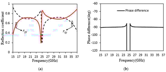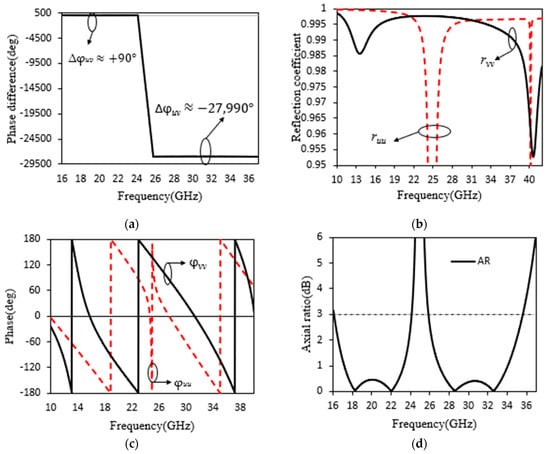 The reflection coefficients of  and -polarization with x- and y-polarized incidence waves are pure imaginary numbers. It is always supposed that the  between them is  It clarifies that in Figure 2b, the  is always  for the dual-frequency bands of 15–24.22 GHz and 25.50–37.0 GHz. When the  the polarization reflection coefficients of the () and () will not be zero, resulting in an elliptical polarized reflected wave, with a phase difference between the () and ( remaining ±90°. The 3 dB axial ratio of the reflected wave using the magnitude ratio of () and () can be found from [] and is given below: