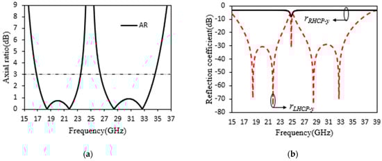 The calculated axial ratio of the proposed converter exists below 3 dB over the dual-frequency wideband of 16.49–23.54 GHz and 26.44–34.56 GHz, as presented in Figure 3a. The 3 dB axial ratio bandwidth within dual-frequency wideband of 16.49–23.54 GHz and 26.44–34.56 GHz is 35.23% and 26.62%, respectively. Additionally, the axial ratio is kept under 1.5 dB, demonstrating that the polarization conversion ratio of the polarization converter is above 99%. Other parameters, called reflection coefficients of the LTC polarization converter (RHCP and LHCP), a polarization conversion ratio, and a polarization extinction ratio are introduced [] to evaluate a linear-to-circular polarization conversion with a promising procedure. We established these parameters of the reflected wave from the following equations, applying the results simulated above.