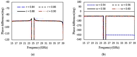 The aim of this section is to investigate how different parameters influence the phase difference and 3 dB axial ratio of the dual-frequency wideband linear-to-circular polarization conversion. To achieve an optimal parameter, we optimized the values of the radial stub (r) and the width of the rectangular patch (w). A sequence of parametric simulations was performed to evaluate the influence of the parameters on the phase difference and 3 dB axial ratio of the converter unit cell when one parameter was changed while the other stayed the same. The calculated results of the parametric phase difference and 3 dB axial ratio of the dual-frequency wideband LTC polarization conversion are shown in Figure 5 and Figure 6. The phase difference of a perfect linear-to-circular polarization converter can be calculated [] from the succeeding equation: