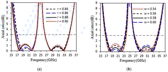 The 3 dB axial ratio of a dual-frequency wideband is influenced by changing the parametric values of the radial stub and width of the rectangular patch, as shown in Figure 6a,b. The resonance peak of the 3 dB axial ratio of a dual-frequency wideband linear-to-circular polarization converter at the lower and higher frequency range was less than 3 dB after increasing the radius of the stub and width of the rectangular patch from 0.84 to 0.90 mm and 0.54 to 0.60 mm, as shown in Figure 6a,b. The parameter ranges r and w shown in Figure 6 were selected to follow the 3 dB axial ratio (0.84 mm–0.90 mm and 0.54 mm–0.60 mm). When the parameters are changed, it is interesting to see that the axial ratio exists below 3 dB. The preceding explanation explains why our proposed reflective metasurface excels in dual-wideband linear-to-circular polarization conversion.