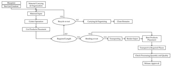 1]. To reduce the loss rate, rebar fabrication techniques have been changed from the field to the plant. To avoid delivery delays, the processing time and loss rate in a rebar fabrication plant’s production process must be estimated. However, the majority of research that is currently available on the fabrication of rebars has been concentrated on the necessary length and cutting processes of rebars, such as standardizing the length and shape of the rebar to reduce the loss rate, or planning the cutting of raw steel imported to the rebar fabrication plant [