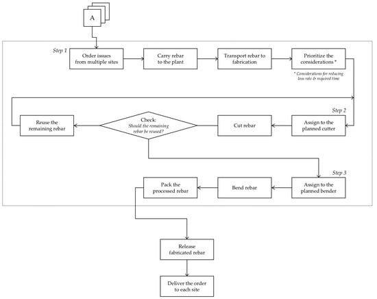 The model construction involves three steps. First, in order to reduce the loss rate and necessary time, it is necessary to identify the critical parameters: Following the importation of raw steel from the steel mill and the delivery to the plant, three factors must be considered: (1) site combination, (2) rebar type (the strength, diameter, length, and the form of rebar sent to the sites for actual building activity), and (3) machines (hoists, cutters, and benders appropriate for specific sites and rebars). Second, the raw steel is cut, and the leftover length is put to use again. The amount of rebars that each cutter can cut at once is shown by how the rebars are cut. The proposed approach was built to utilize the most cutting-edge resources possible. Reusing the rebars in this situation is crucial to lowering the loss rate. If the length of the rebar after it has been cut exceeds the length necessary for the type of rebar required at the site, it must be processed into a rebar with a reduced length. The loss rate in this process varies depending on the priority of each rebar type. The third step involves bending the cut rebar. Rebars of various shapes that must be bent are configured to pass through the bender.