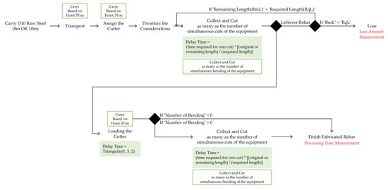 Figure 2), the quality of the processed rebar is checked, and it is then shipped to individual sites. Although this process is straightforward, the loss rate is challenging to minimize because several variables associated with the (1) raw steel, (2) machine, (3) rebar shape, and (4) hoist must be considered. Additionally, we first set the variables that have a decisive effect on reducing the loss rate and necessary time. Firstly, the reason why time is considered the most important among these is that the model built is based on a discrete-event simulation. Secondly, considering the priority, time-related variables were set as major variables.