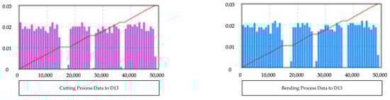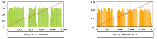 Figure 8, rise over time. As a result, the individual phases in the processing of rebar can be reflected in the suggested simulation model.