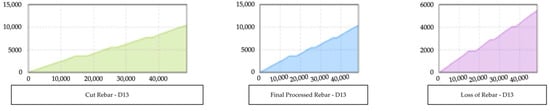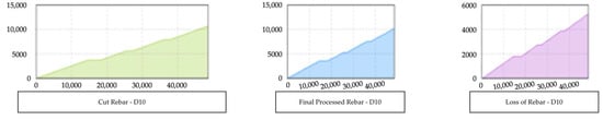Human aspects were not taken into account because the model’s variables only included raw steel and machine characteristics. Consequently, the results obtained using the simulation model may be different from the loss rate of the actual rebar fabrication plant. Nevertheless, this study makes several valuable contributions. First, the suggested model may take into account the machine specifications for each piece of machinery that affects the processing speed and loss rate. By adjusting the parameter values to acquire the optimization results, the suggested model may, thus, be simply applied to any plant. Second, the manager’s experience or intuition are often used to manage the loss rate. The suggested model can assist in creating an objective plan for the fabrication of rebar. Because it can reduce the percentage of material prices in construction projects, the decreased loss rate has a substantial economic impact. In future work, the proposed model can be extended to more diverse cases to optimize project costs in the construction industry.