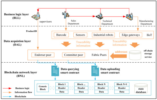 A blockchain-based product data management system (BPDMS) is constructed for ETO-type production, as shown in Figure 2. The BPDMS can be divided into three levels from top to bottom: business logic, data acquisition, and the blockchain network. The three layers are interrelated.