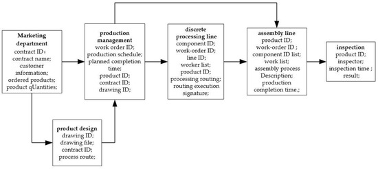 Engineer-to-order (ETO) production means that products are engineered and produced after orders have been received. This production method helps to meet the exact specifications of customers [1]. With the increasing personalized needs of customers, more and more enterprises have adopted the production model of ETO for their development, which accounts for an increasing proportion in the manufacturing industry. The ETO production mode is a highly discrete production type and is the most complex in the manufacturing environment. ETO manufacturing faces many challenges in production [2,3,4,5]. Customers’ needs are personalized and diversified, making it impossible to reuse the manufacturing process of the produced products. Furthermore, the relevant information about the new product can only be determined after the design drawings are released, including material code, BOM, and process route. This delay also directly leads to the lack of effective control of the collaborative cost of production. In addition, enterprises in the ETO production model have many discrete workshops for processing semi-finished products. Therefore, to meet the customer’s customized needs for products and the traceability of the production process, it is necessary to ensure the accuracy of product processing and the credibility of the production process information after the product is completed.