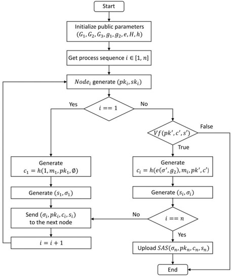 To facilitate interpretation and improve readability, the relevant notations in the SAS mechanism are listed, as shown in Table 1. The bilinear mapping on the elliptic curve , and the secure hash function and , are used in the signature scheme. The SAS scheme designed in [49] is adopted, which extends the BSL03 [48] scheme architecture, including three parts: