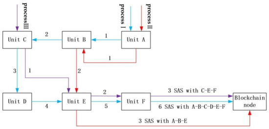 For the convenience of description, the execution route of process II marked in red in Figure 5 can be taken as an example. If the process route of the product is set to pass through the production units A, B, and E in sequence, then the signature of the product needs to be generated by orderly aggregation of the signatures of the three production units in the order of A, B, and E. Finally, through the verification of the aggregated signature, it can be checked whether the production process is actually completed through each corresponding production unit in the order of route II.