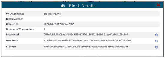In this section, the data of the semi-finished product processing department are uploaded to the blockchain as a test case. According to the execution process of the processing route in discrete workshops, the system packages the operation data of each production unit into transactions, and then uploads the transactions to the blockchain network to generate a new block. The generated transaction information and block information are shown in Figure 6 and Figure 7, respectively.