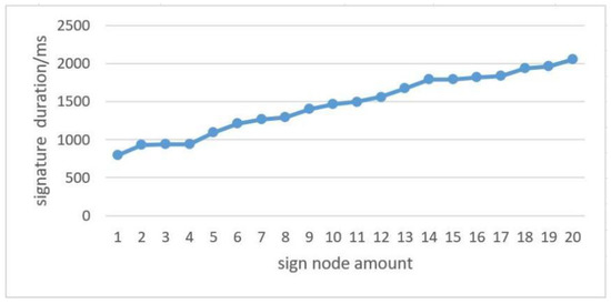 The sequential aggregate signature is used both in discrete production of semi-finished products and in the assembly of products. The execution time of the sequential aggregate signature algorithm used to verify product routing is tested. When the process route is only one node, the signature time is only 0.799 s. Then, as the complexity of the component process increases, the number of processing units that need to be processed, and the signature time, also increase. As shown in Figure 10, when the number of signed nodes exceeds one, the signature time is increased by 66 ms for each additional node. The test results show that the sequential aggregation signature algorithm has good execution efficiency and fully meets the requirements of information collection in the production process.