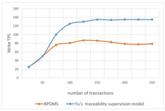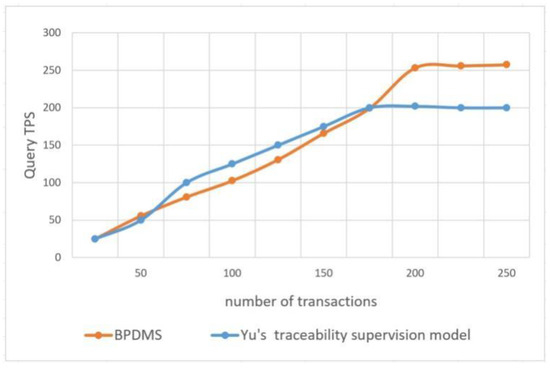 First, a comparison is made of the throughput rate of write data and query data of the channel in the blockchain network. The design department channel of BPDMS and a single chain in Yu’s scheme is taken as an example. The experiment takes 25 transactions as a group, and adopts the method of gradually increasing the number of transactions. The results are shown in Figure 11 and Figure 12, respectively. When the number of processing transactions is between 25 and 100, the write throughput increases linearly, and gradually flattens after reaching 100; when the number of processed transactions is between 25 and 200, the query throughput increases linearly, and gradually flattens after reaching 200. Compared with Yu’s solution, the throughput performance of BPDMS is slightly poorer in terms of write performance, but superior in terms of query performance.