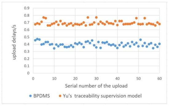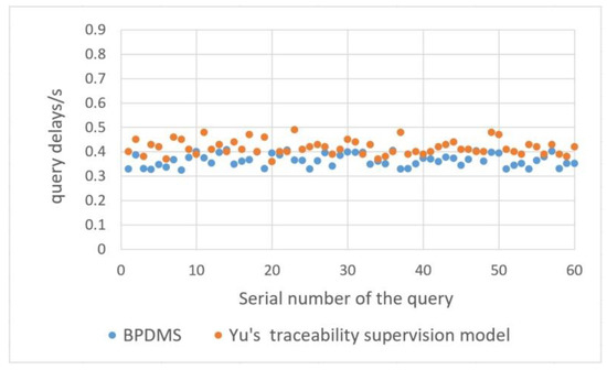 In addition, the accounting time and query delay time of the blockchain network channels of the two systems are compared. The design department channel of BPDMS and a single chain in Yu’s scheme are again taken as an example. The test of uploading 60 data blocks to the chain is used, and the results of the accounting time are shown in Figure 13. Similarly, 60 non-repeated queries are selected on the design department channel, and the results of the delay time are shown in Figure 14. Compared with Yu’s solution, the accounting performance of BPDMS is better, and the query performance is similar.