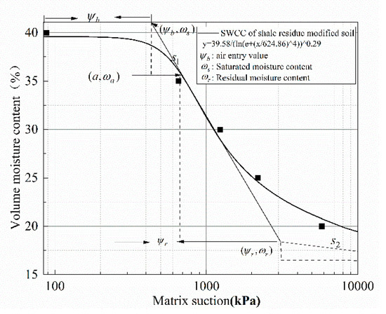 The fitted SWCCs were then plotted on a semi-logarithmic coordinate system (Figure 1). Auxiliary lines and feature points are also shown according to the morphological features of the SWCC.