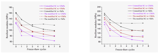 Considering the empirical prediction of the MR in seasonally frozen areas, it is also necessary to adapt and describe the changing trend of the MR after freeze–thaw cycles. Jilin University’s research group [25,29] conducted a series of tests under dynamic loads on oil shale residue-modified soil after freeze–thaw cycles, the relationship between the MR obtained from the experiments and the freeze-thaw cycles was shown in Figure 2.
