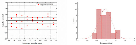 As can be seen in Figure 3, the prediction residuals of model (7) are mainly distributed between −10 and 10, accounting for 85.2% of the sample size, and the residual distribution is close to the normal distribution. There is no obvious distribution relationship between the prediction error and the modulus. In Table 4, the fitting parameter R2 is greater than 0.95, which represents the proportion of the sum of squares of total errors that can be explained by the sum of squares of regression in linear regression analysis, indicating a good degree of fit.