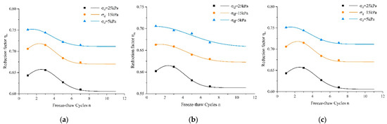 Fitting curves of freeze–thaw reduction coefficients. (a) σ3 = 50 kPa; (b) σ3 = 40 kPa; (c) σ3 = 30 kPa.