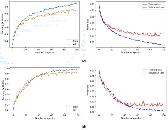 The training and validation accuracies along with losses of SER models for the (a) BAVED, (b) EMO-DB, (c) SAVEE, and (d) EMOVO.