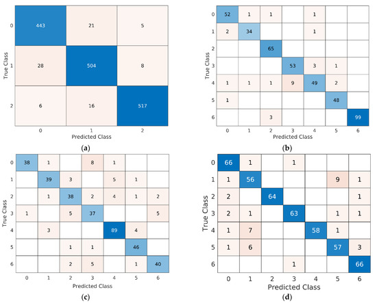 Confusion matrixes of the BAVED, EMO-DB, SAVEE, and EMOVO. (a) The BAVED; (b) the EMO-DB; (c) the SAVEE; (d) the EMOVO. The y-axes illustrate the true/actual labels, and the x-axis illustrates the predicted labels.