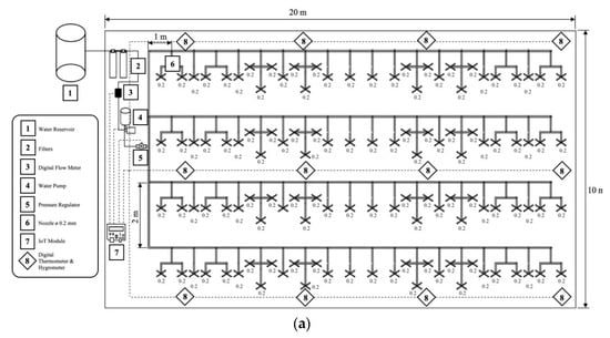 As displayed in Figure 2a–c, the equipment components consist of: (1) a 500-L reservoir tank (Penguin brand, Indonesia); (2) two units of metal water filters (Zernii brand, Indonesia); (3) one digital flow meter unit (K24 brand, Indonesia); (4) one unit of the water pump with water discharge capability of “0.5 to 2 L/min” (Hiu brand, Indonesia); (5) one unit of pressure regulator “3 to 5 bar” (Hiu brand, Indonesia); (6) 120 nozzle units with “0.2 mm” diameter slip lock type (Pearl brand, Indonesia); (7) one internet of thing (IoT) module (Sonoff WiFi TH-16 Smart Switch brand, China), and (8) twelve digital thermometer–hygrometer units (HTC-2 brand, China).